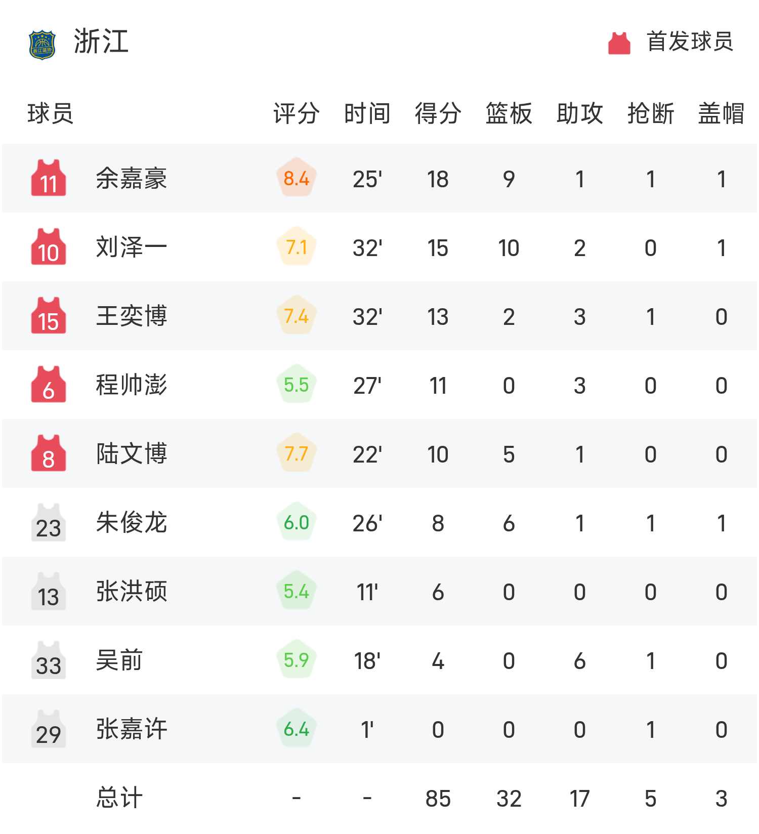 全运男篮战报:余嘉豪18分9板,浙江85-81险胜山东