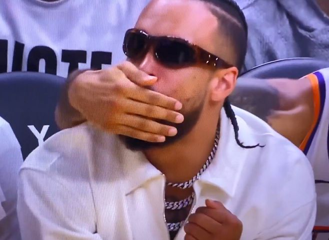 今日太阳球员狄龙·布鲁克斯持续缺阵,然而坐在板凳上的狄龙却在末节喋喋不休说着垃圾话,有趣的是太阳队友以赛亚·利弗斯的动作,利弗斯先搂住了狄龙,发现狄龙持续口吐芬芳后利弗斯捂住了狄龙的嘴巴,并向裁判员表示是自己在讲话。