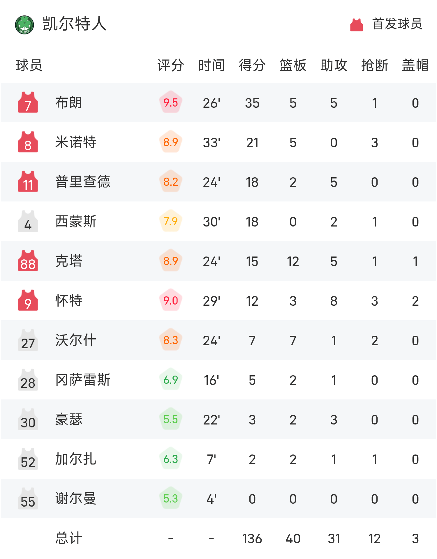 6686体育app11月06日讯 25/26赛季NBA 常规赛,凯尔特人对阵奇才。双方全场战罢,凯尔特人136-107战胜奇才。布朗砍下全场最高的35分5板5助,率领凯尔特人胜利取胜。