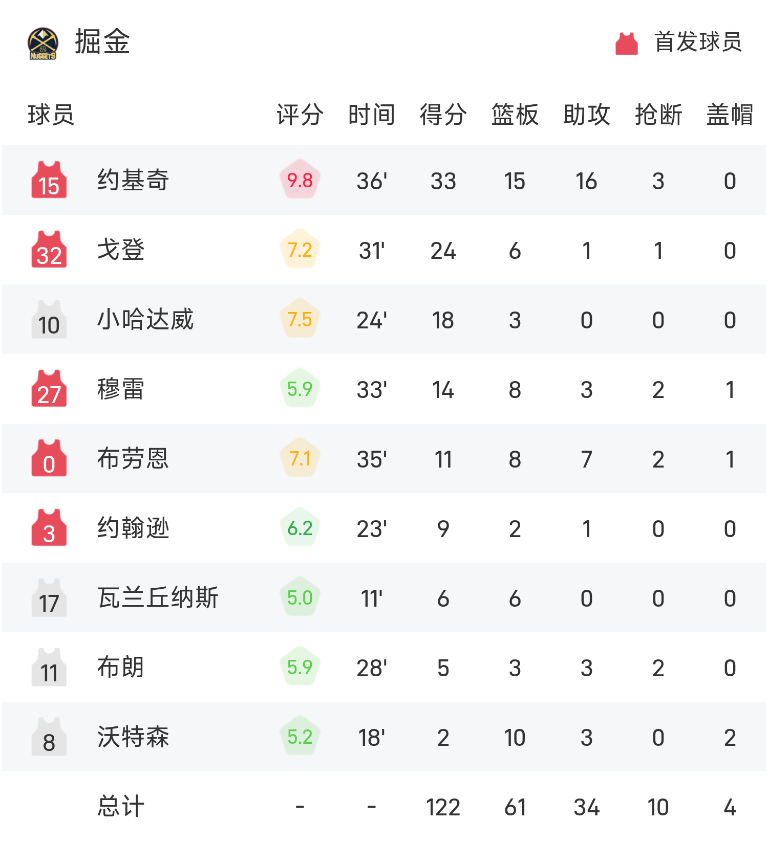 约基奇砍下全场最高的33分15板16助,率领掘金胜利取胜。