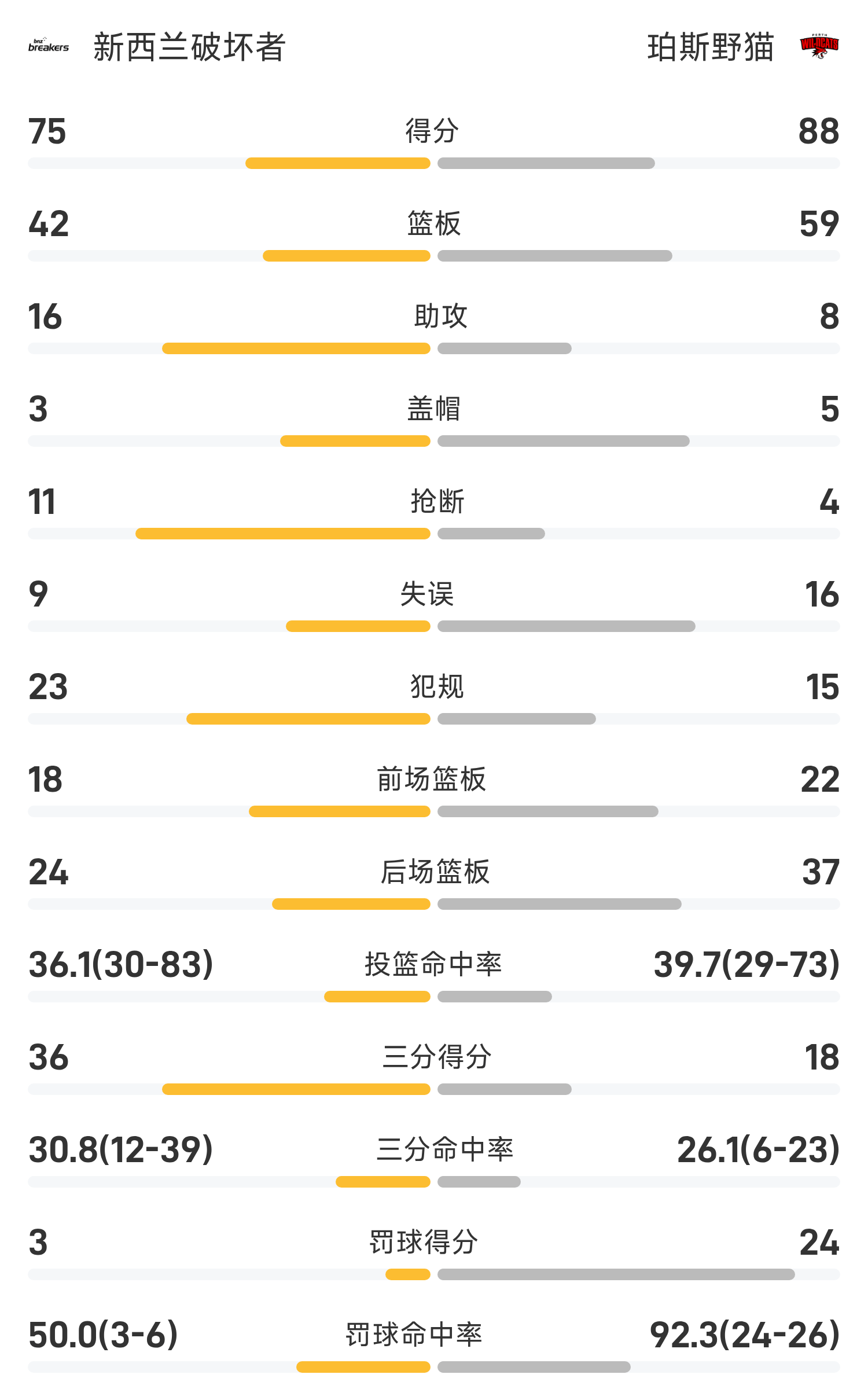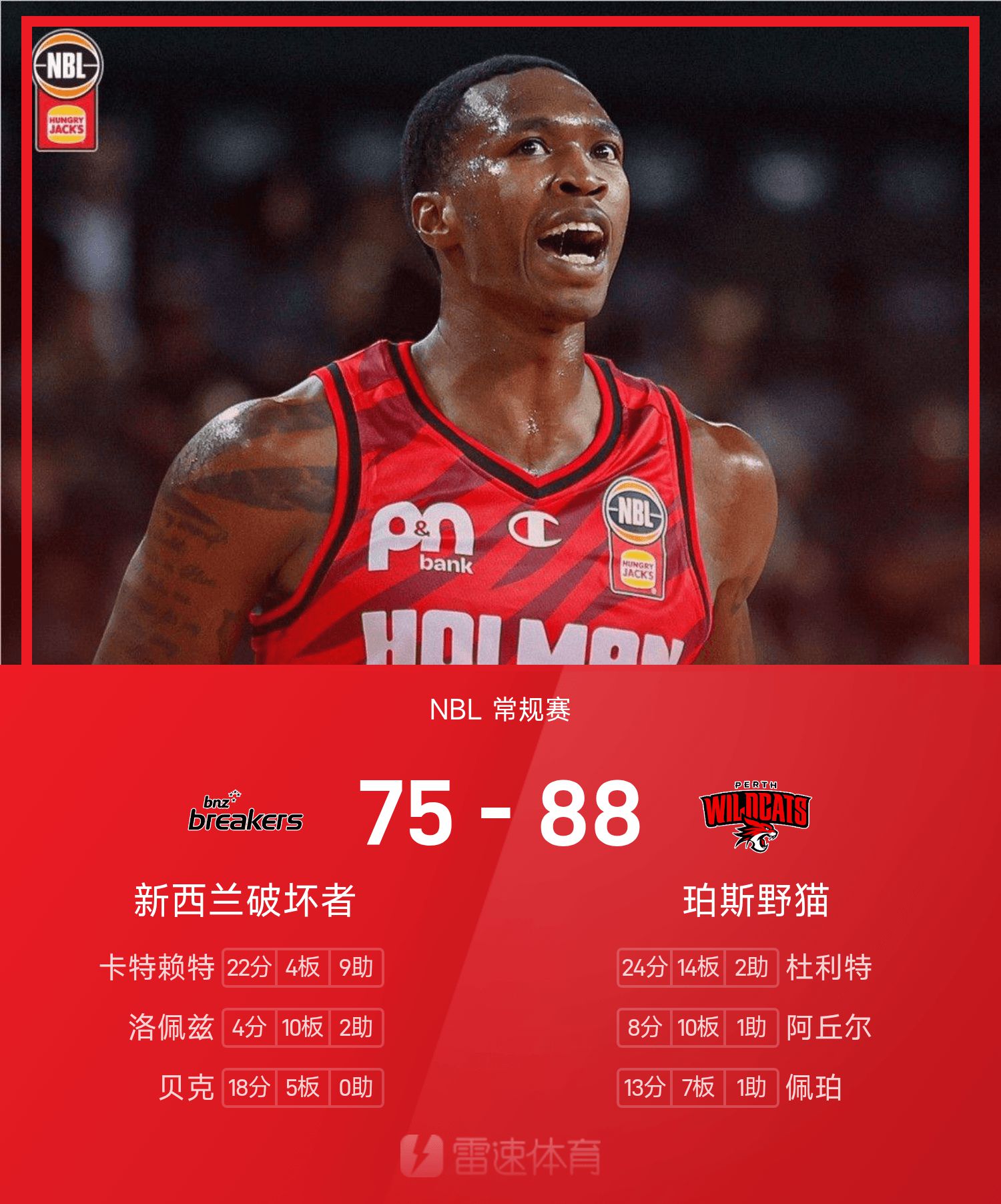 6686体育app11月15日讯 25/26赛季NBL 常规赛,珀斯野猫对阵新西兰毁坏者。双方全场战罢,珀斯野猫88-75战胜新西兰毁坏者。杜利特砍下全场最高的24分14板2助,率领珀斯野猫胜利取胜。