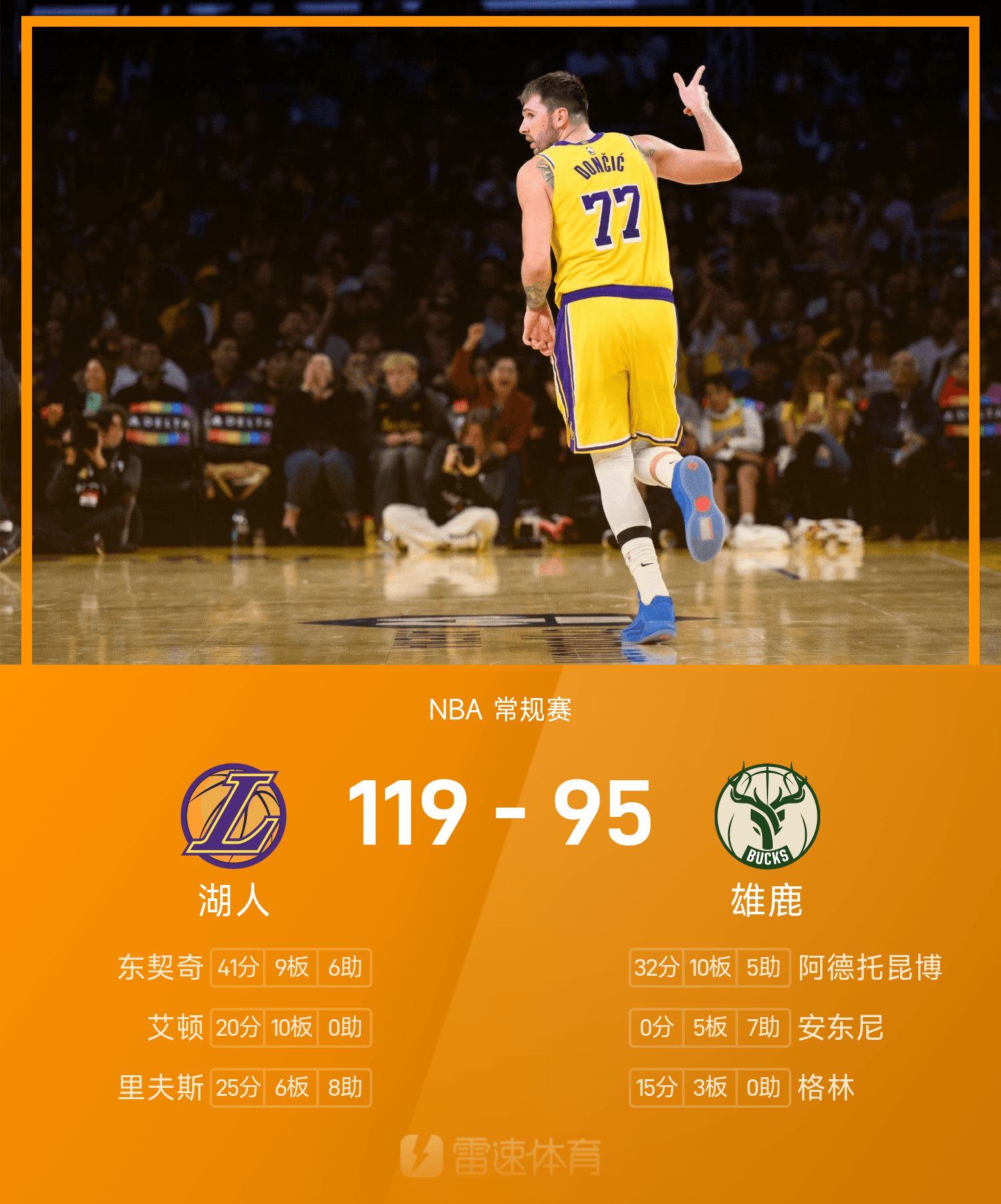 NBA战报:东契奇41分9板6助,字母哥32分,湖人119-95雄鹿