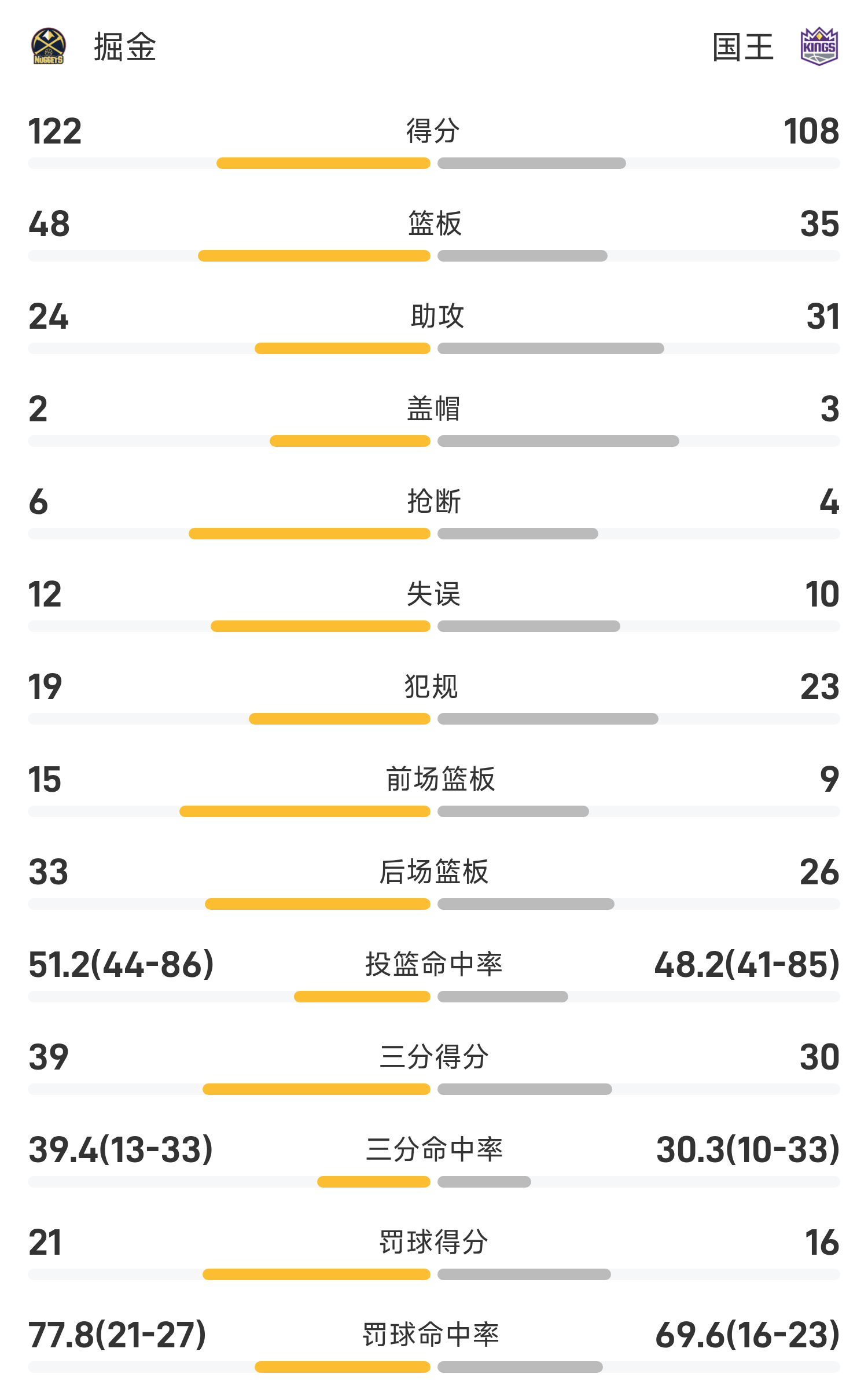 双方全场战罢,国王108-122不敌掘金。