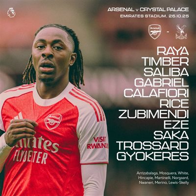 6686体育app10月26日讯 英超联赛事第9轮,阿森纳主队场迎战水晶宫。赛前,两队首发阵容出炉。