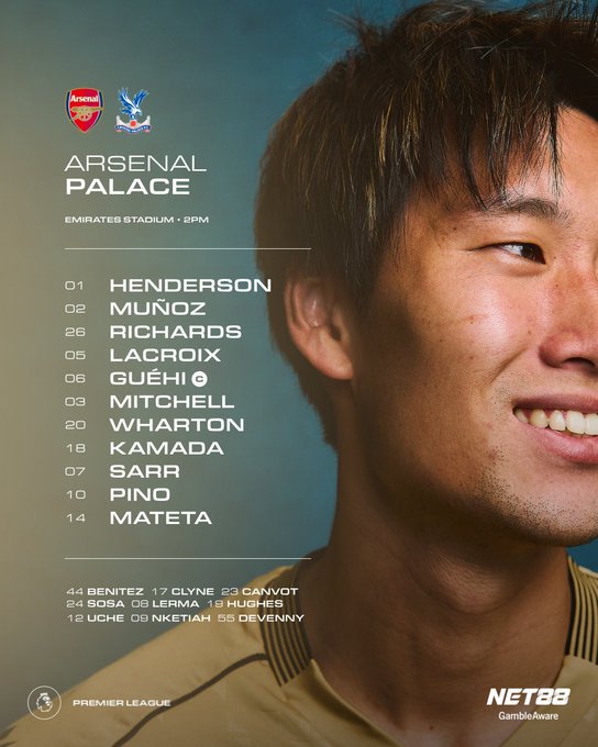 水晶宫首发:1-迪恩·亨德森、2-穆尼奥斯、3-米切尔、6-格伊、5-拉克鲁瓦、26-理查兹、18-镰田大地、20-沃顿、7-萨尔、10-皮诺、14-马特塔