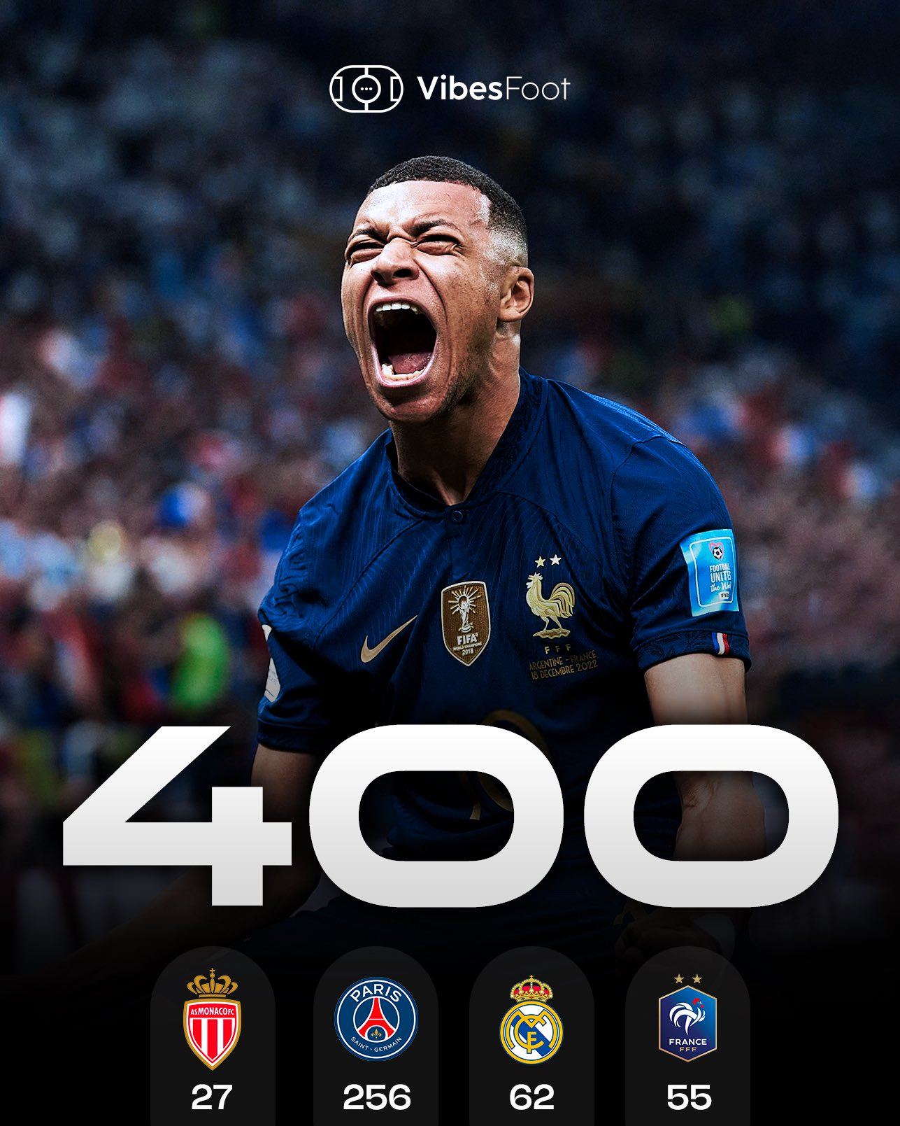 6686体育app11月14日讯 世欧预倒数第二轮,姆巴佩梅开二度,法国4-0击败乌克兰,获得世杯赛入场券。而姆巴佩也达成了职业生涯400球里程碑。