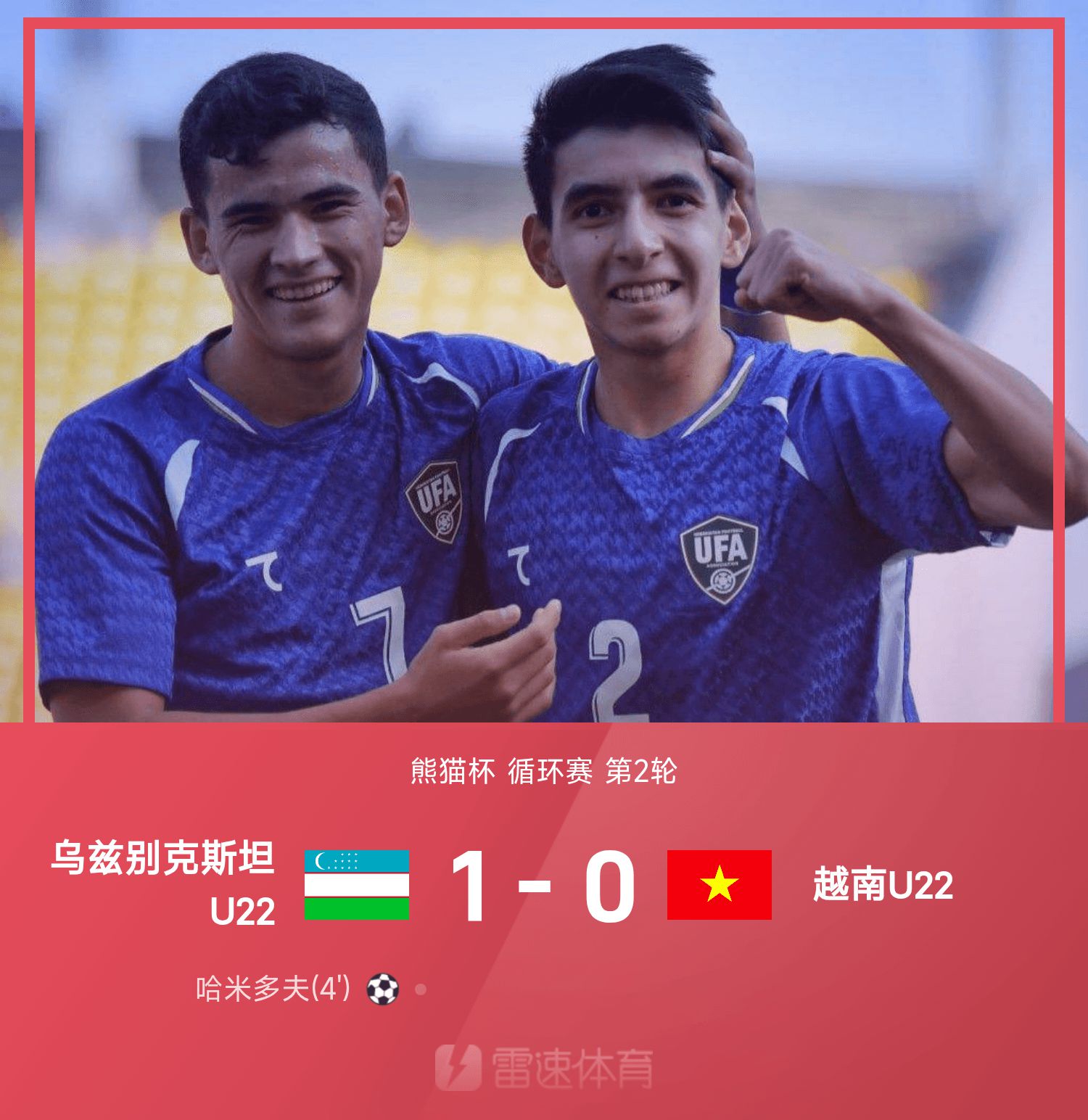 6686体育app11月15日讯 25赛季熊猫杯循环赛第2轮,乌兹别克斯坦U22以1-0战胜越南U22。全场竞赛,哈米多夫破门建功。目前熊猫杯参赛球队仅中国U22未获得胜出局,国青首场0-1不敌越南,今晚19:35将迎来韩国国青的挑战。