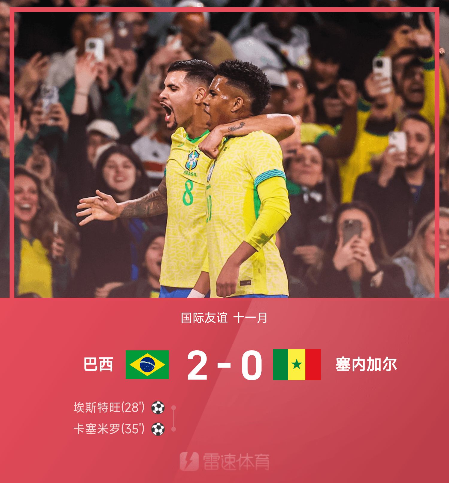 6686体育app11月16日讯 25赛季国际友谊十一月,巴西2-0战胜塞内加尔。上半场竞赛,埃斯特旺右路大力轰门得手,卡塞米罗运用对手差错机会抢点破门,下半场双方均无建树,加布里埃尔受伤离场。