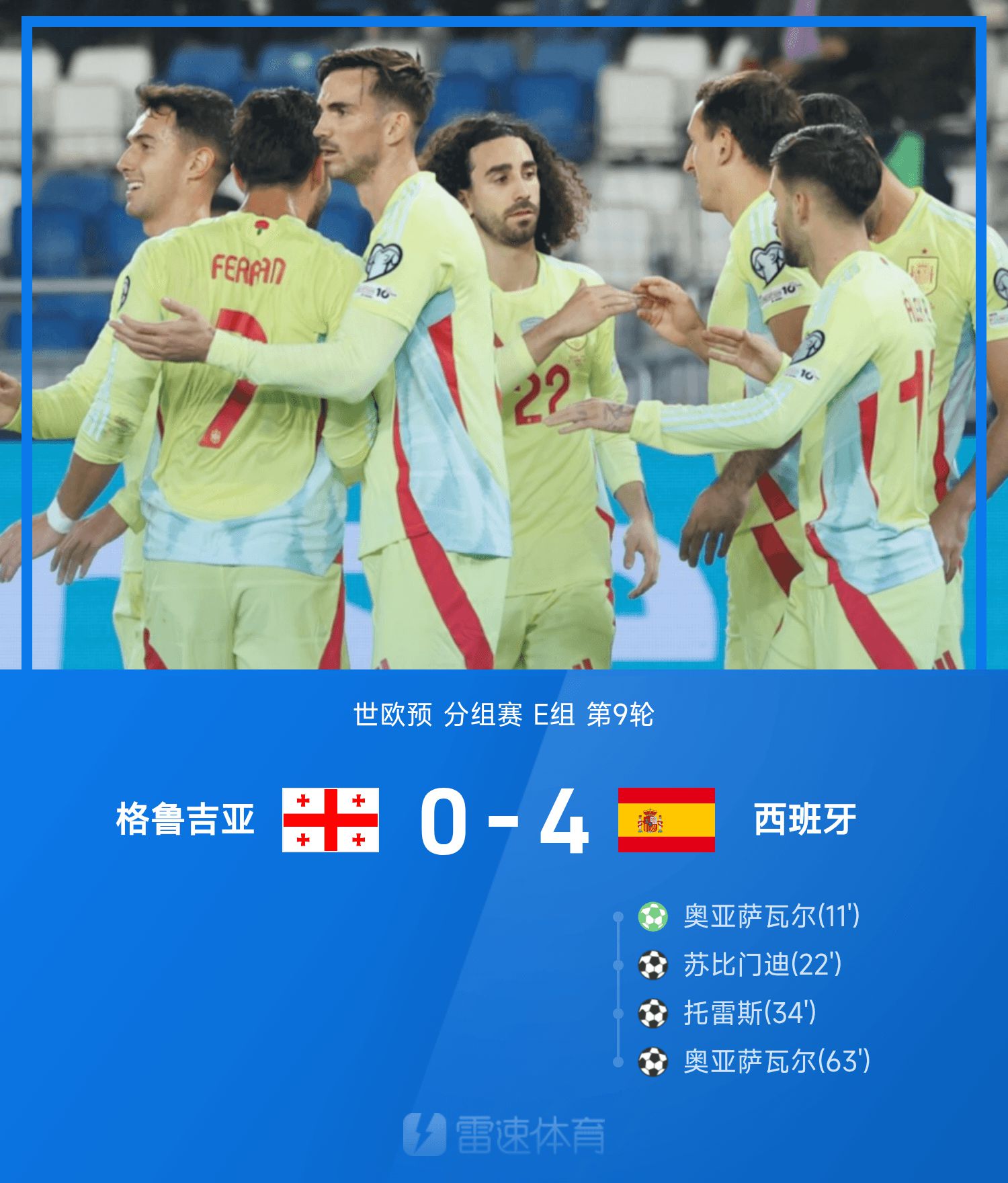 世欧预战报:奥亚萨瓦尔双响,西班牙4-0格鲁吉亚基本锁定出线
