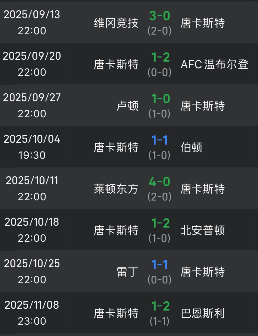 竞技状态低迷!唐卡斯特近8轮英甲未尝胜绩,仅取得2平6负